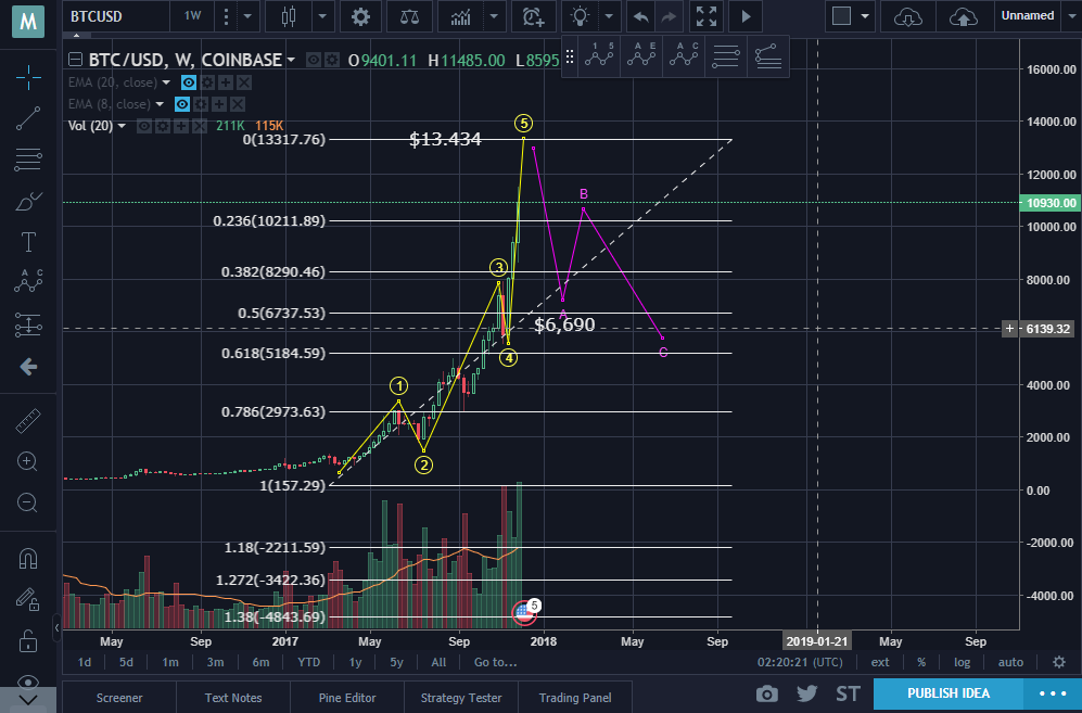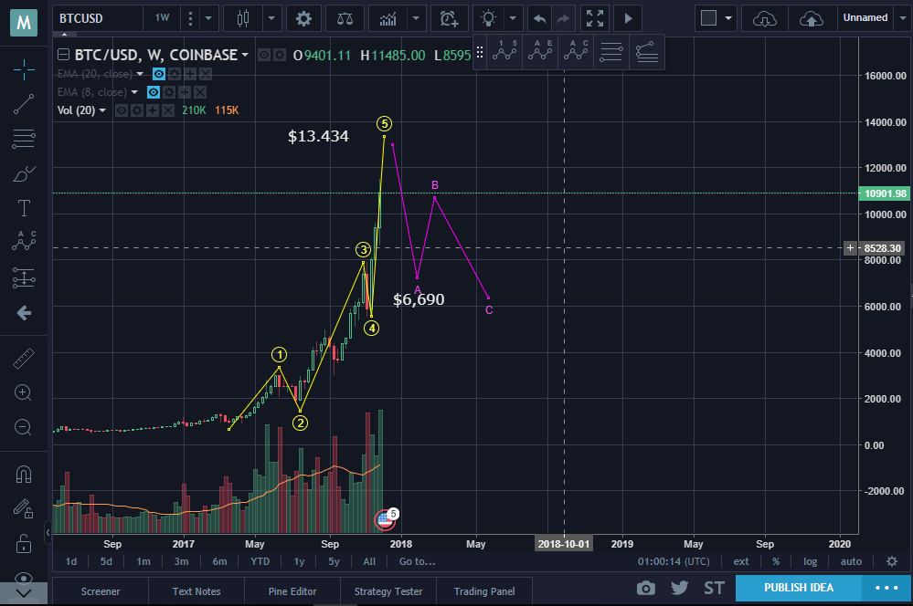 Este es un análisis a mediano plazo que he hecho en la gráfica de una semana, todo esto con ondas de Elliot. Al parecer bitcoin esta a medio camino de una onda 5 que es la final, su tope sera aproximadamente en los 13.000 usd, o puede ser menos. Por experiencia en estos mercados la onda A de corrección siempre es mas grande que la C, si esto se da podría haber una corrección hasta los 7.000 usd aprox. Es de aclarar que no seria malo, las correcciones son saludables, los precios no crecen indefinidamente!.
