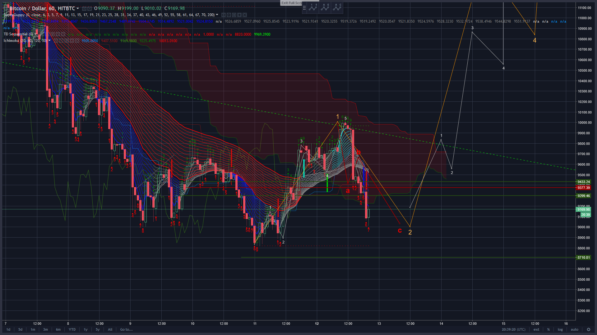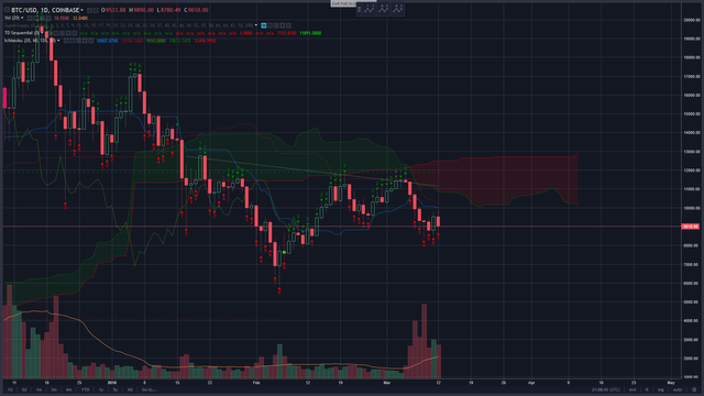 The daily chart is also the most bearish, and a quick glanse say we could get a dip to the red dotted support at $7.200, but the way TD Sequential have counted it is unlikely to have a massive candle down. We'll have to see the end of todays candle as I don't get much clear information of the past two days candles.