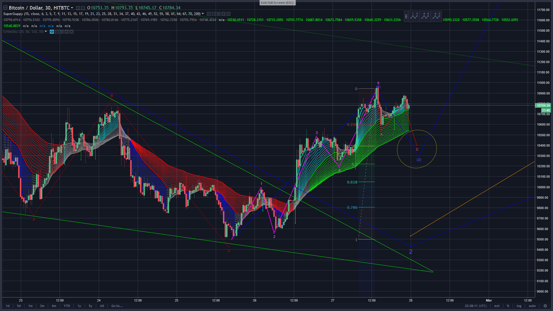 I have adjusted the corrective ABC just a tad up from yesterday and think it will turn around $10,300, just pinching the Ichimoku cloud, and about 0.382 fibonacci.