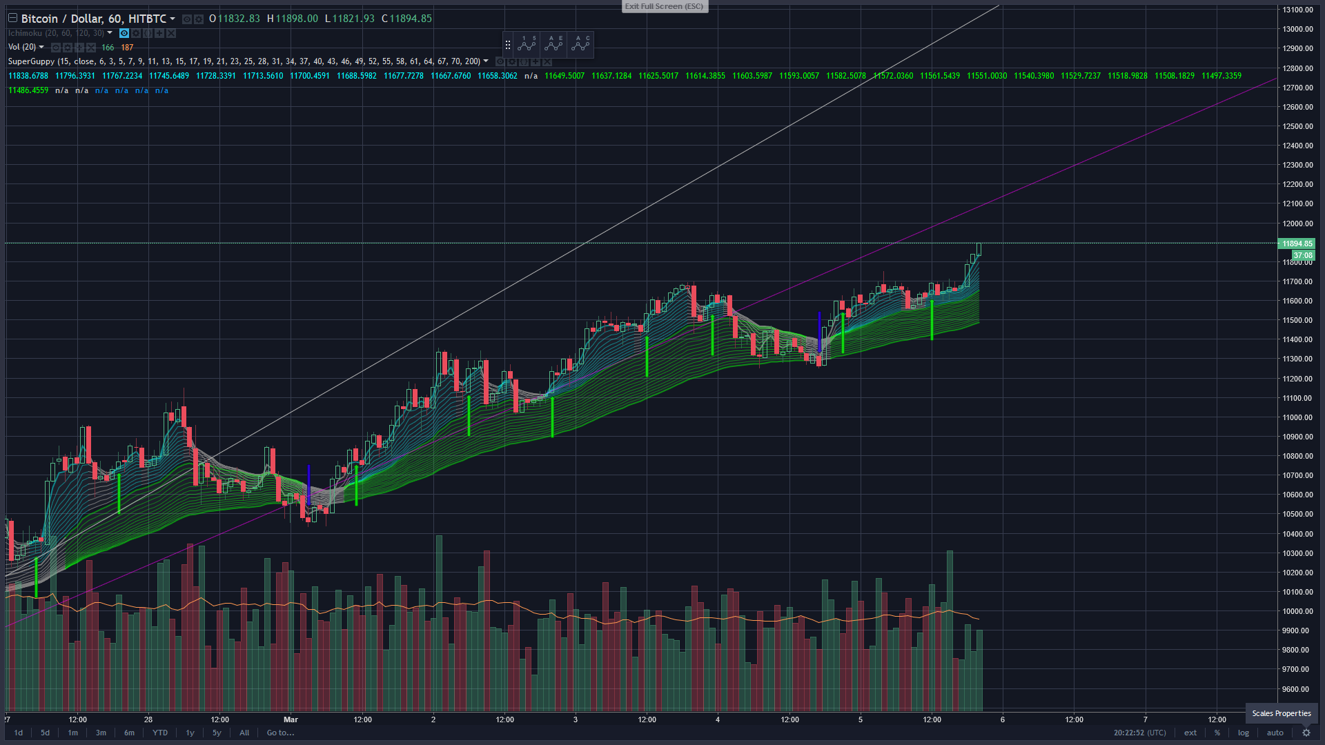 The aqua traders group is widening above green investors group, indicating trades accepted higher. A relative constant distance in investors group indicate investors are holding their coins.