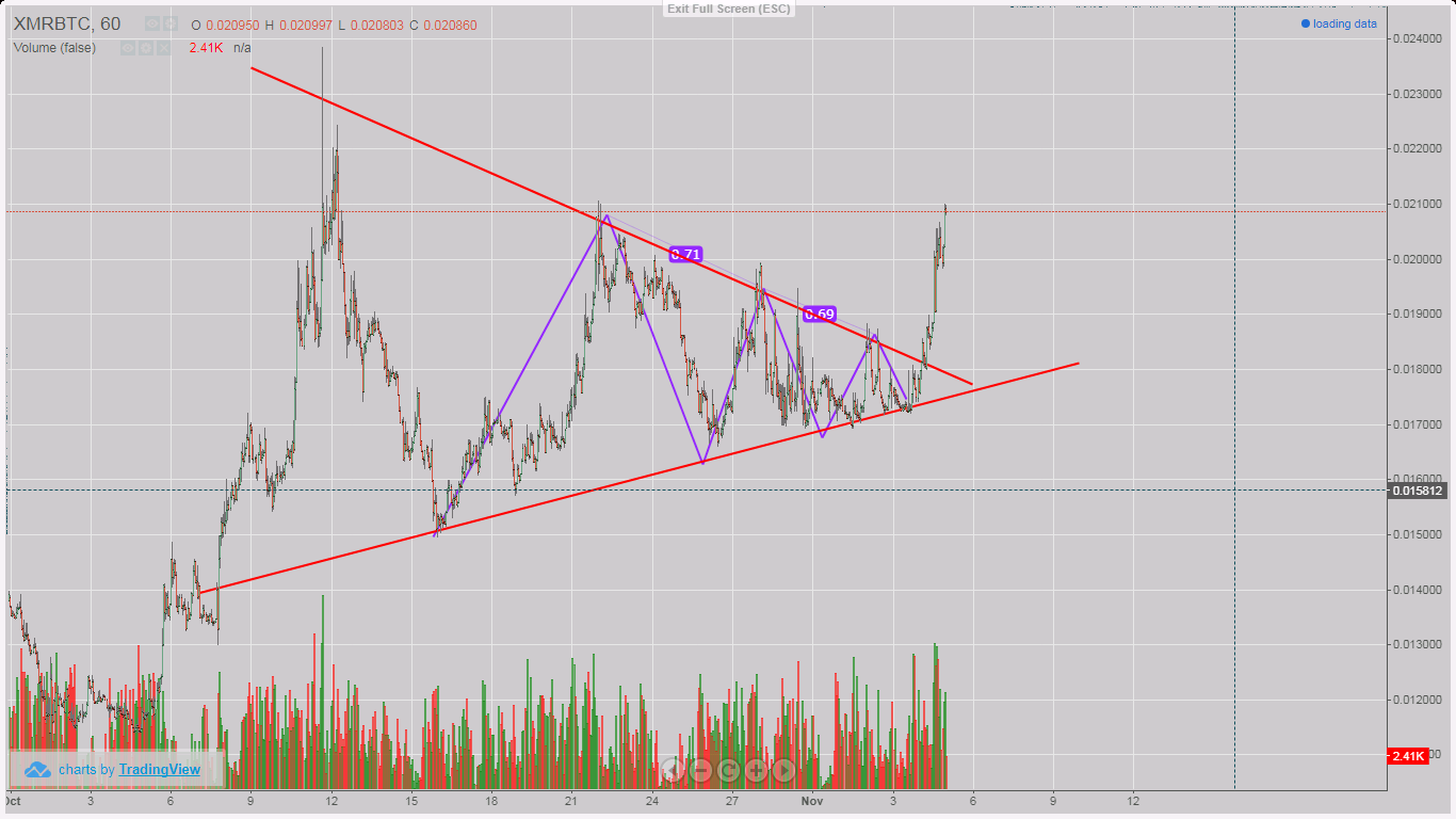 Thanks @haejin, I'd like to post a picture of the Hitbtc chart, but can't figure out how in a comment. Last couple of weeks there looks more like a bullish triangle on xmr-btc, and xmr-usd just about finishing wave 1 after an abc correction.