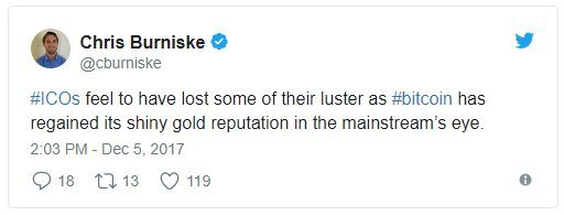 Chris Burniske, co-founder of Placeholder Ventures, said on Twitter that ICOs have lost their appeal to a Bitcoin that claims more than ever its domination of the entire ecosystem.