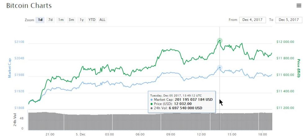 The price of Bitcoin exceeded this afternoon, the space of a short moment, the bar of 12 000 dollars, setting a new historical record.