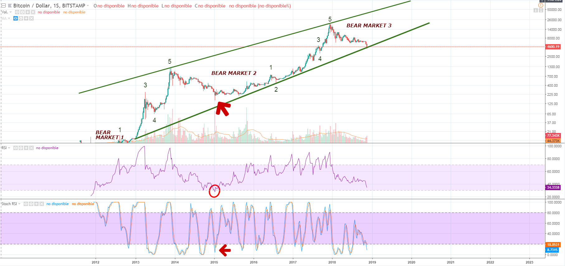 According to that, seems that the most likely scenario will be a lower low coming within a week or two and, in order for the RSI to reach an oversold condition at the weekly time-frame, it seems that around 3000 USD may be our more secure support.