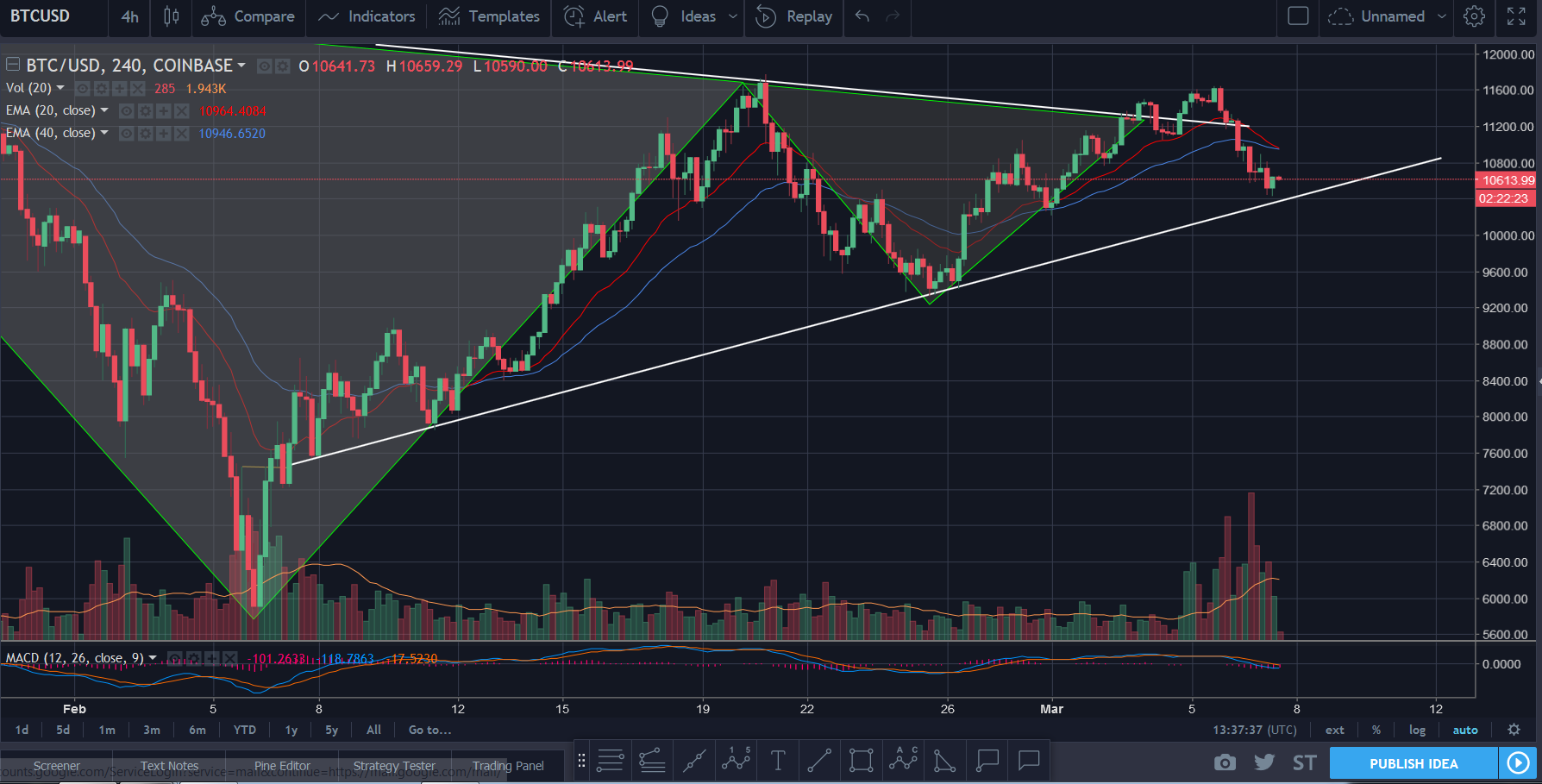 I recently posted my Bitcoin Morning Analysis I believe we may have reached bottom and could see a little more consolidation before we break out of $11,000 zone. @tradrhacks I've been following you on social media for quiet sometime now, if it's the same Roddrigo... big fan haha. March will be a bull month and crypto will take off. If i were to interpret this into human behavior I would say this is amateur money be shaken out. Too many new investors/traders getting involved into cryptocurrencies and not understanding how they really work. Recently there was a huge wave of new users who signed up for Investfeed (Essentially a Crypto Twitter) a lot of these users had no idea what cryptocurrencies were, not even Bitcoin. Media is slamming Bitcoin into the faces of the people, causing FOMO. When you wake up to a 12% drop emotions get involved and you pull out(*repeat). Those who understand Technical Analysis, the technology behind the coins, and market cycles haven't even flinched during all this madness. Thank you for taking the time to read this.