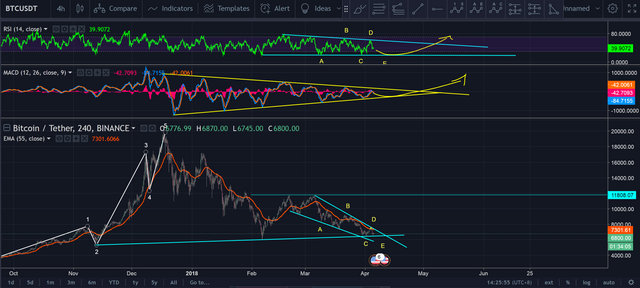 The previous ABCDE corrective wave was invalidated due to the failure of breaching the $6.4 - $6.7k zone. I have adjusted the ABCDE corrective wave, supported by the 4-hr RSI and MACD indicators, as shown below.