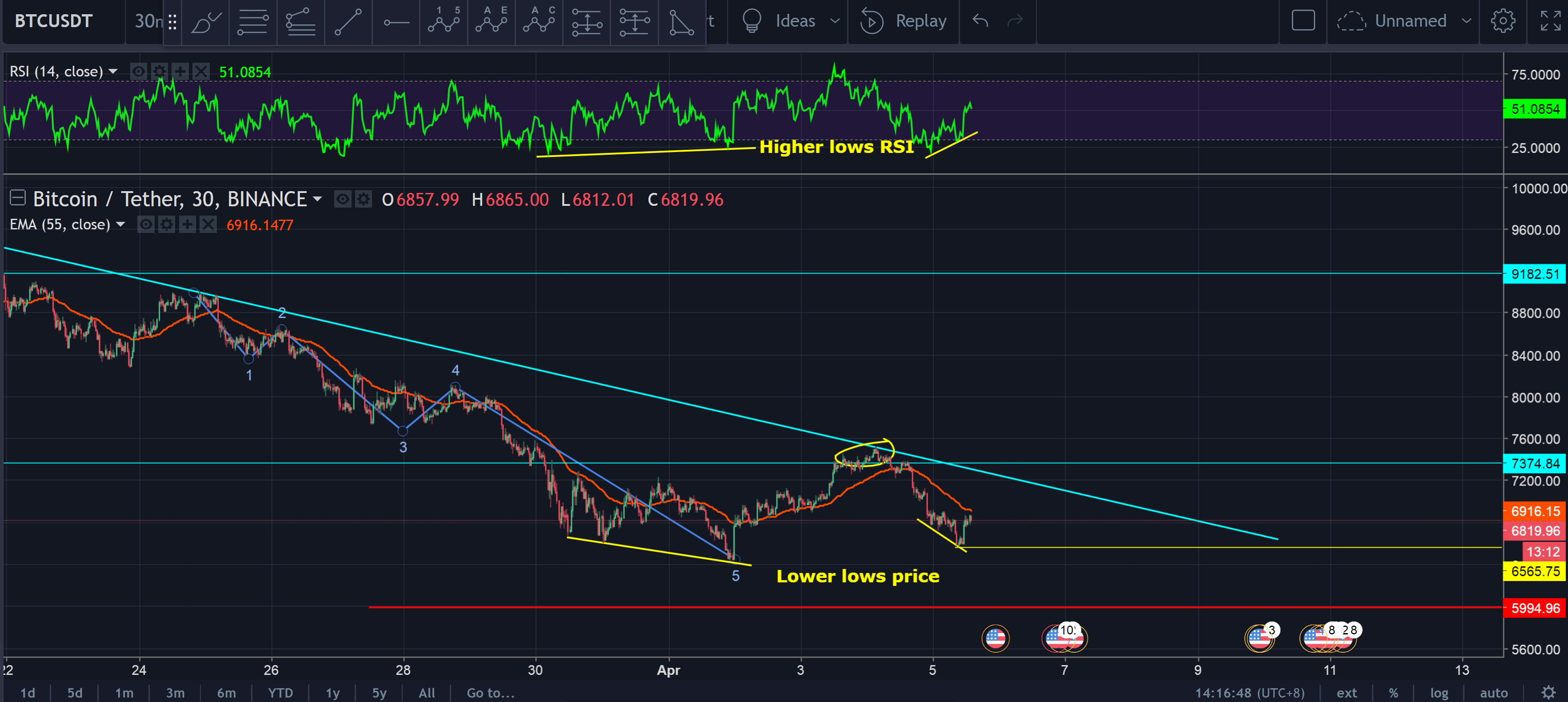 Looking at the 30-min RSI, it shows that the bears are weakening as we are getting higher low RSI but lower low price, thus, it further support the bullish move in the mid - term.