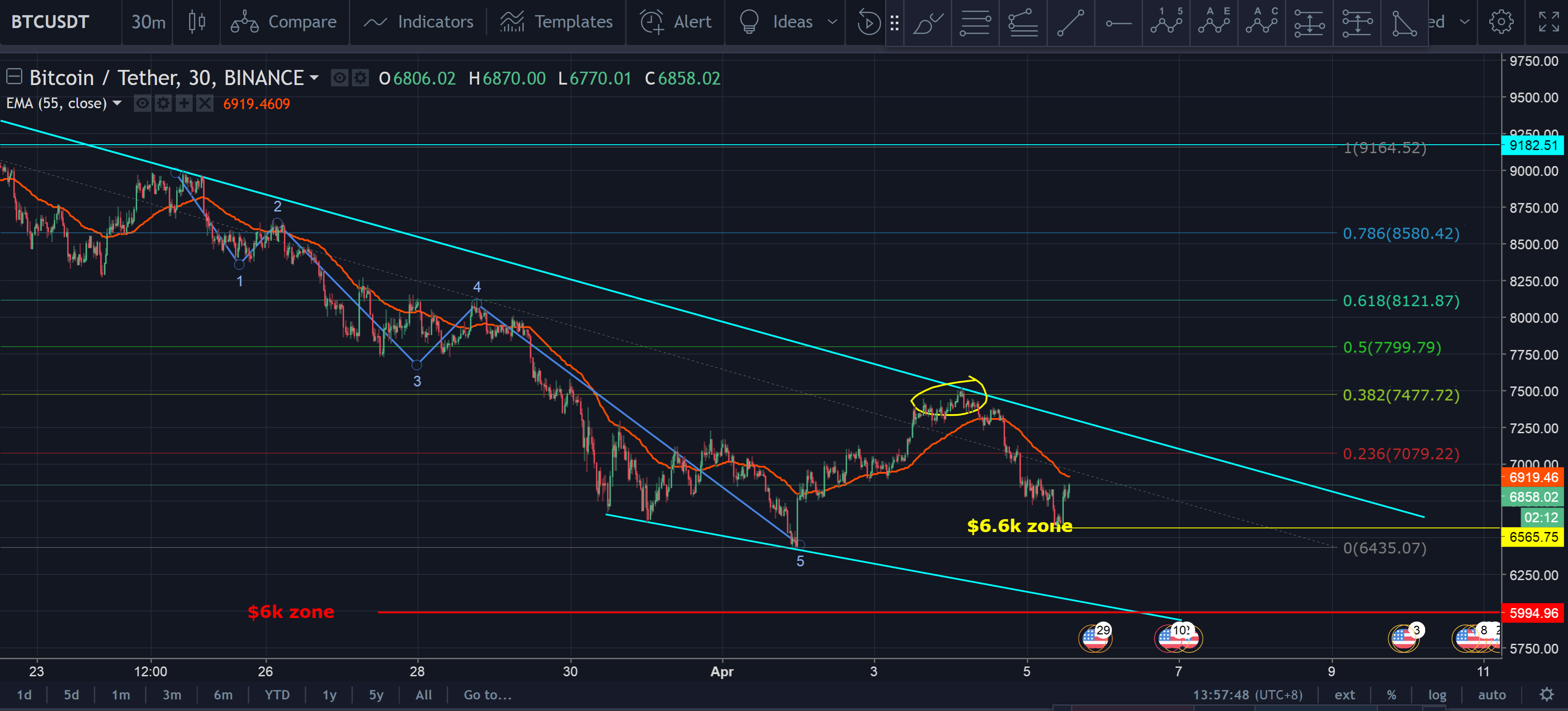 The last time I updated, I have expressed that failure to breach the $6.4k - $6.7k zone will bounce the price back up to $6.4k zone. Looking at the price chart, the price bounced back as expected up to $6.58k and it is currently at $6.85k.