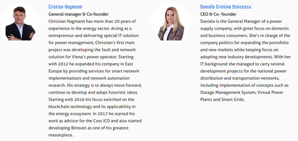 Bittwatt has two co-founders, Cristian Hagmann(right side) also is the general manager of the project and Daniela Cristina Stoicescu(left side) is also the CEO of Bittwatt. Talking about experience, Hagmann has had more than 20 years of experience working energy and power department and had this idea before to implement. Seeing the right opportunity he decided to power it. He already had contact will Stocicescu, who is incharge of a power supply company. Then they co-founded this company.