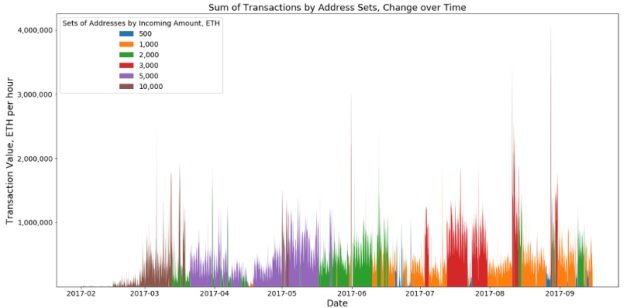 The exact analysis of the observed addresses reveals a particular scheme. The researchers have classified the addresses into six groups: addresses that receive 500, 1,000, 2,000, 3,000, 5,000 or 10,000 emitters via transaction. "The chart shows how these sets of addresses complement each other almost one to one. Take a set of addresses, such as those that receive about 1,000 Eths. After they are active for a while, they become inactive, and another set, such as one with addresses that receive 3,000 ETHs per transaction. It acts as if the behavior of the addresses is orchestrated, which leads us to the presumption that there is a certain system that coordinates these activities. "