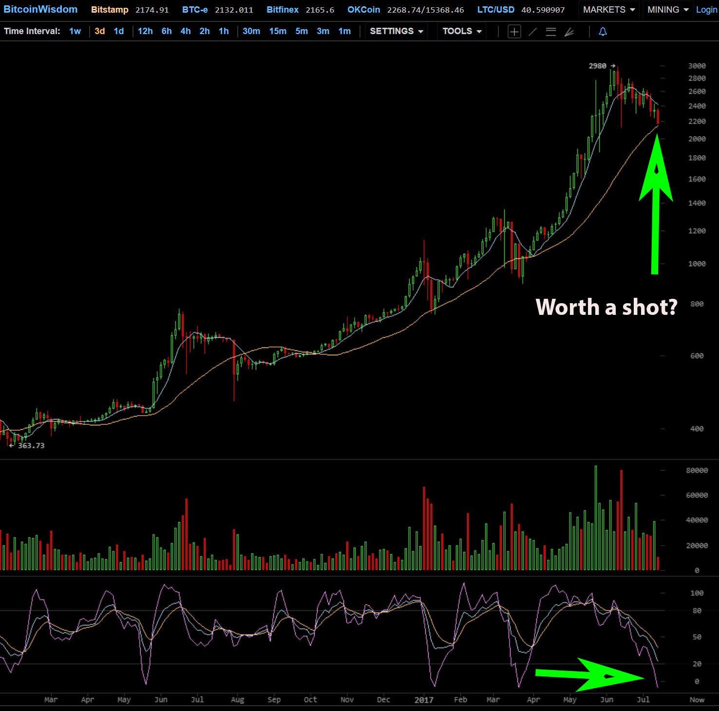 The 3 day chart shows the KDJ indicator really going to the bottom line. This is healthy, together with the price reaching the longer term moving average. This could be an area of some support. Therefore, similar to what's written at the daily chart, first daredevils or dollar-cost-averaging-investors could take this as a moment to make a first bid. The movement towards $2,200 has materialised and could result in a quick punch through the longer Moving Average to the $2,000-$1,800. described above. As indicated in the last article, this would fit a narrative of increased uncertainty in the Bitcoin scene now that the 1 August 2017 deadline is rapidly approaching.