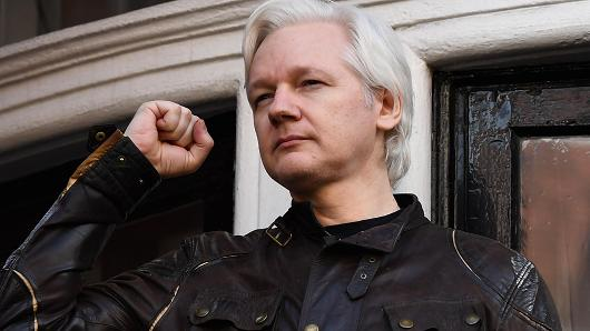 Wikileaks founder Julian Assange raises his fist prior to addressing the media on the balcony of the Embassy of Ecuador in London on May 19, 2017.