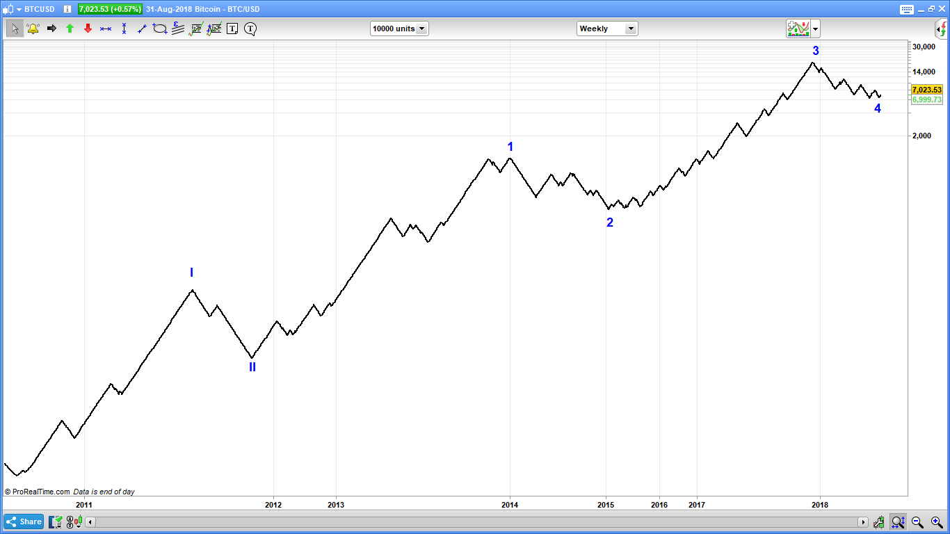 The above chart shows bitcoin data from the middle of July 2010 until today and we can clearly see an Elliott five wave impulse that seems to have been completed. The theory states that prices should now drop more or less to the previous wave four, which is around 200$.