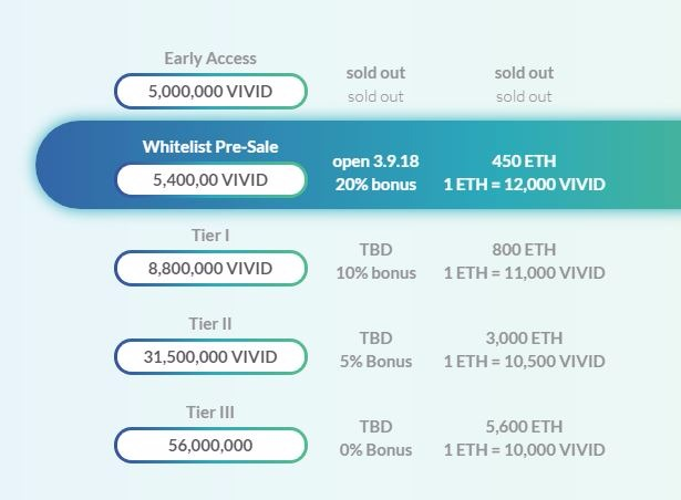 Acara penjualan token yang nyata akan diadakan untuk distribusi token VIVID, yang merupakan gerbang Anda ke fitur premium, voting, dan layanan yang ditawarkan di seluruh ekosistem Vivid. Vivid adalah persediaan tetap 140 Juta Ethereum ERC20 dengan ticker VIVID. Token yang dapat diperdagangkan ini didasarkan dari standar ERC20 dan beroperasi di atas blockchain Ethereum yang memfasilitasi pembuatan aplikasi yang terdesentralisasi.