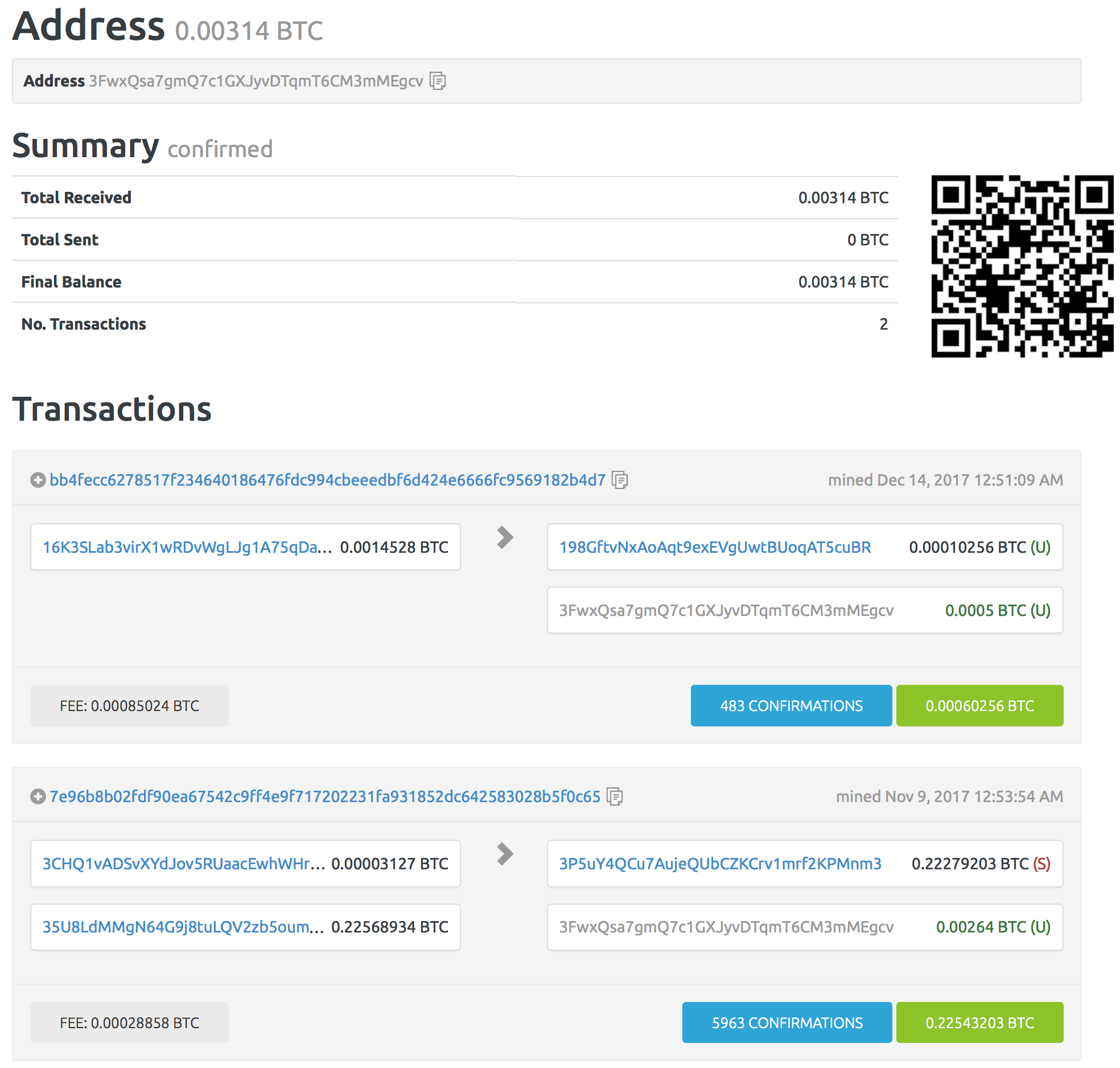 You will see the bitcoin public address at the top, the transaction id’s (there are only two at this address), and the encumbrances showing the source and destination.