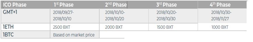 ICO private sales will star t from 12PM September 10th. Investors can purchase BXT Tokens in 4 phases on a first-come, first-served basis until 14,000,000 tokens are sold out. As each new phase starts, the price will increase. Investors will receive BXT Instantly at the point of purchase (Self Drop). The detailed schedule is as below: