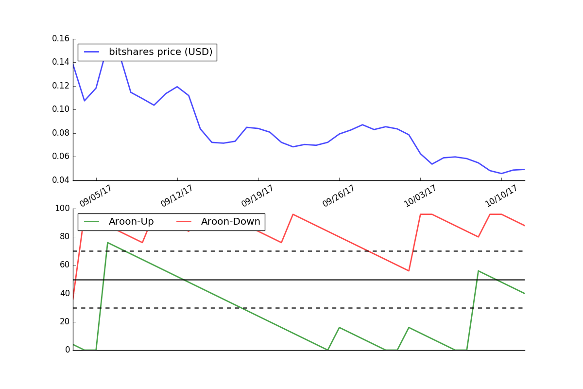 The graph below shows the Aroon Indicator using the price of Bitshares over the last 40 days.