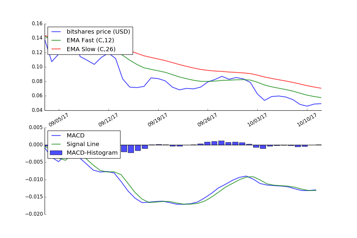 The graph below shows the MACD applied to the price of Bitshares using daily price data for the last 40 days.