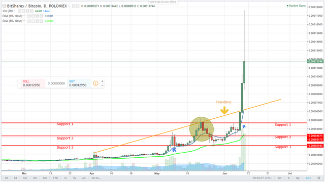 Bithsares has been trading in euphoric level. If i draw your attention on chart below you can notice that it had been traded in 1 Satoshi till earlier part of May but then it gave its first breakout marked in blue arrow in chart from Support 3 which was resistance before and after this breakout it shoot up and then next day come down to check support which was resistance before, consolidated few days there at support area then again went up, gave breakout but that proved to be false breakout out (which I marked in circle) later. Then after some consolidation and testing patience of both bears and bull, it finally given a breakout from resistance which is now marked as blue arrow from Support 1 below in chart. This breakout has happened on day before yesterday and man this script has given just rocket moves after breakout.