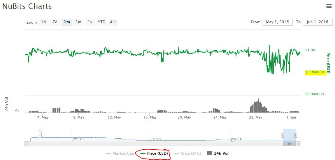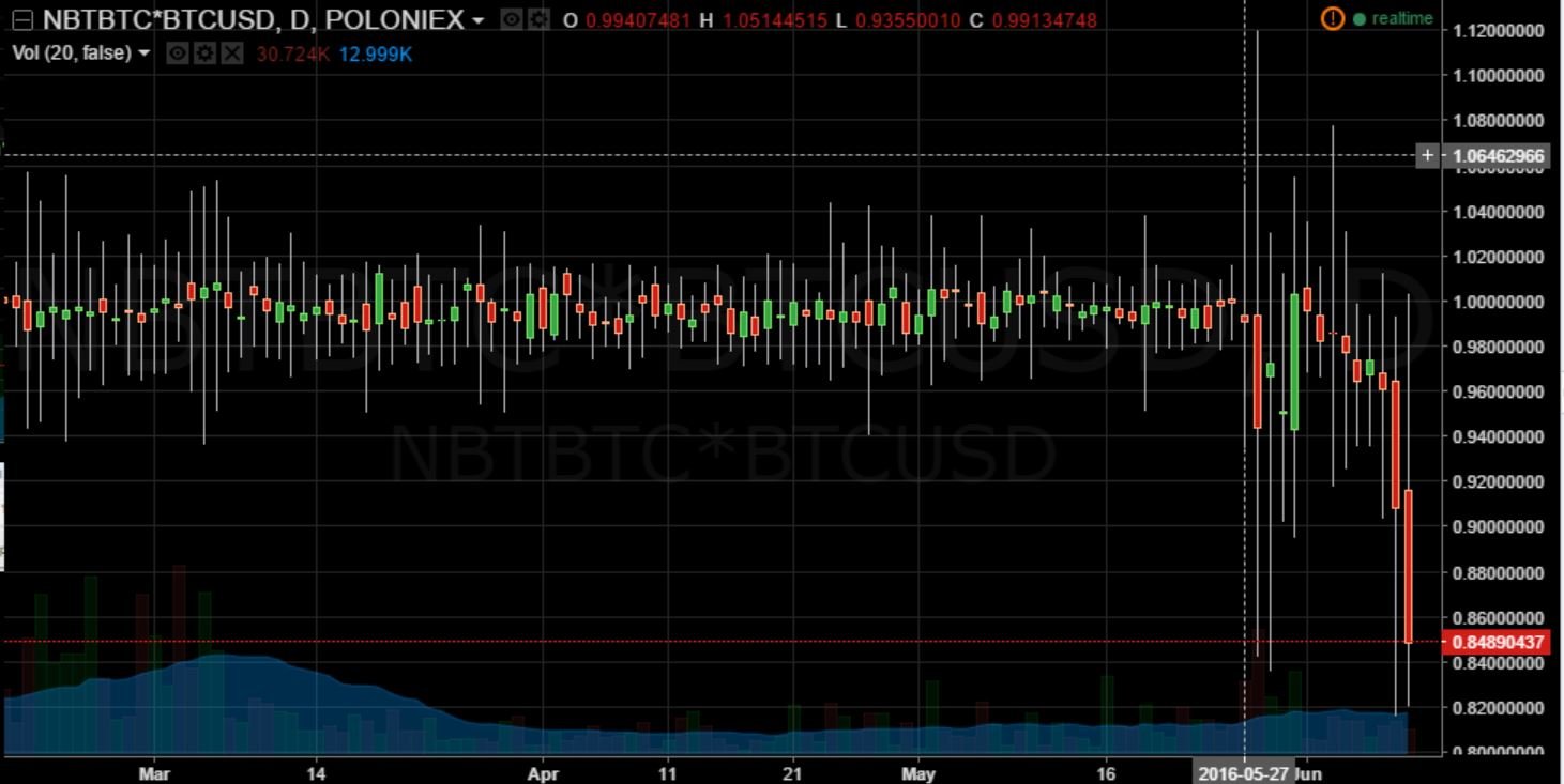 The current supply in circulation of NuBits is 757,084 and at current price that means a total market cap of 757,084 USD; problem is that this 757,084 dollars’ worth of NBT is being backed by only less than 5000 USD worth of bitcoin at the moment and the peg is being broken to the down side!