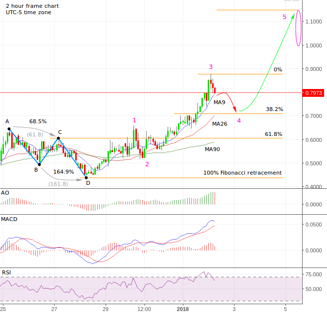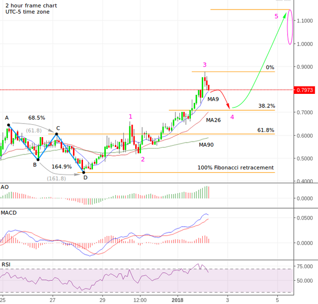 So from point D an uptrend start and we have already reach the top of the second impulse wave (3). Now bears will regroup and try to hold a line or gain some ground they will probably push to the $0.71 level (38.2$ retracement level), but then bulls will start the next offensive with target around $1.00 level, could be also up to $1.14 (161.8$ extension level) the higher the better. (I will welcome some extra bucks!!)