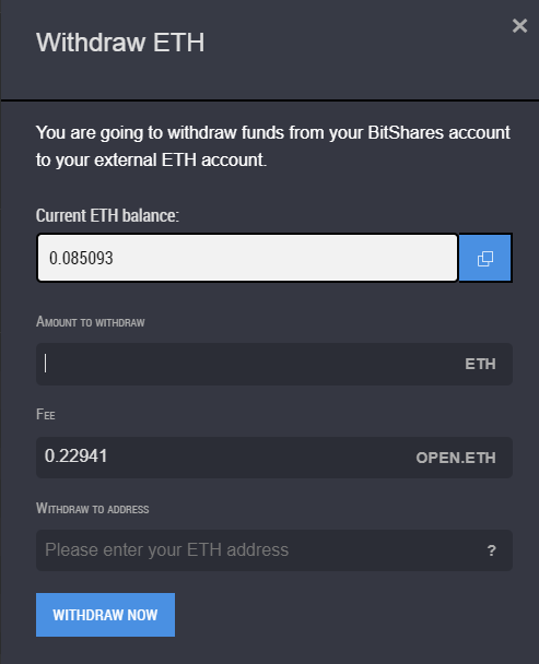 You are viewing a single comment's thread from:RE: How to convert STEEM to BITCOIN on bitshares | save $6 withdrawal FEES by using BITSHARES exchange instead of bittrex ExchangeView the full contextturpsy (62)in #bitshares • 8 years ago I deposit some ETH on the bitshares now. I want to withdraw it, but the transaction fees is more than the amount. It not allowing me to progress. Is there a limit you can withdraw there?