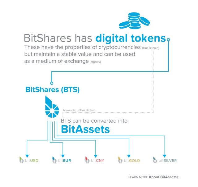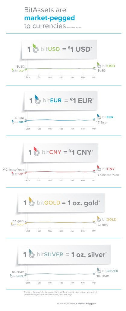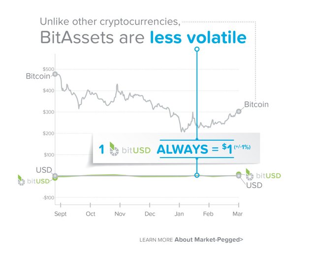 BitAssets are a unique component of the BitShares system: they minimize the risk of volatility in the cryptocurrency market by pegging the BitAssets (bitUSD, bitEuro) to common currencies like USD, Euro, etc.