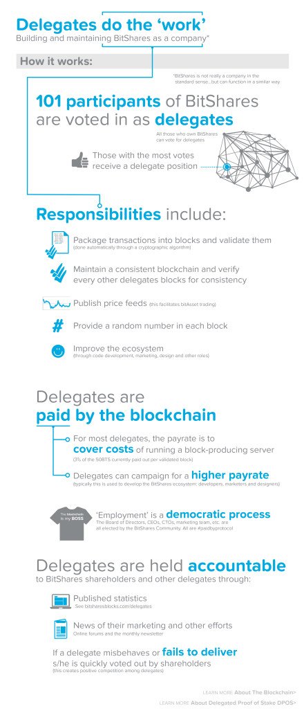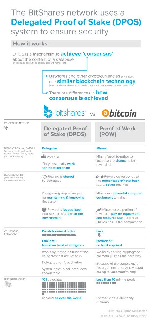 BitShares (similar to BitCoin, but based on a more decentralized, collaborative environment) works through a delegate system (known as Delegated Proof of Stake – DPOS) instead of the resource-intensive mining that many alternative currencies use.