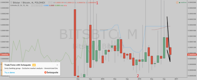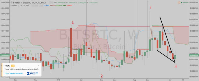 In the monthly chart, I believe Bitstar is in the wave three. The wave one started in the May 2014, and finished in the August 2014. The wave two correction ended in the December 2015.