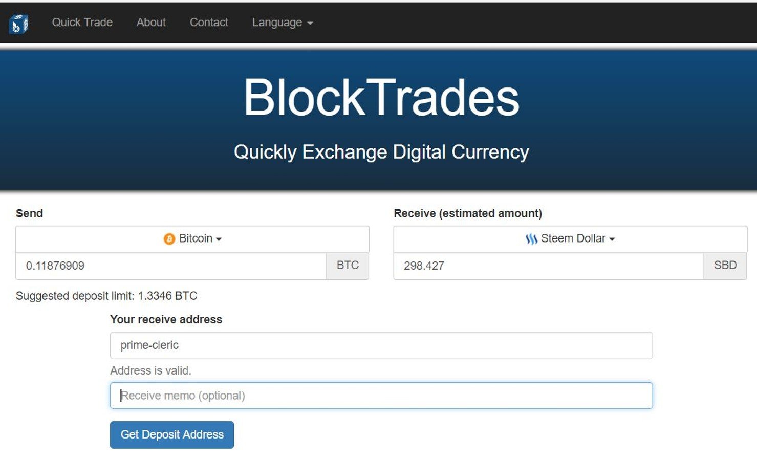 Click on "Get Deposit Address" copy the address to your Bittrex Wallet by clicking on the minus - button on your Bitcoin wallet, enter the Deposit Address given by BlockTrades, as well as the amount of Bitcoin you are trading, click on the "Withdrawal" button.