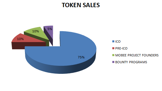 As the picture above, we can conclude that 75% of total tokens will be allocated to ICO, as much as 10% in PRE-ICO, as much as 10% will be allocated to mobee project founders, and the remaining 5% will be allocated to bounty programs.