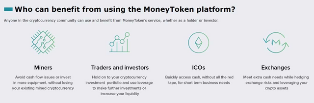 Many people want to take out loans but have to spend their crypto coins and also withdraw any future gains they would have made in the growth in value for those coins in exchange for taking the loan. The MoneyToken platform allows you to borrow liquid funds instantly based on the current value of your cryptocurrency assets.