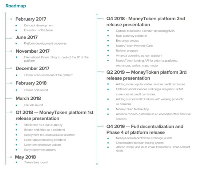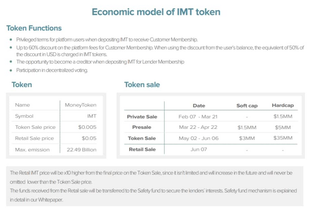 MoneyToken is performing a tokensale for the release of the IMT tokens for the platform, Out of a total of 22.49 billion tokens, 42.17% are allocated to the public tokensale, 4.7% are for private and presales, 40% are in a reserve fund, 10% are allocated to the team, 2% are for advisors, 2% for future relationships and 1% is for bounty. The Soft Cap of the tokensale is 3 million and the Hard Cap is 35 million dollars American.