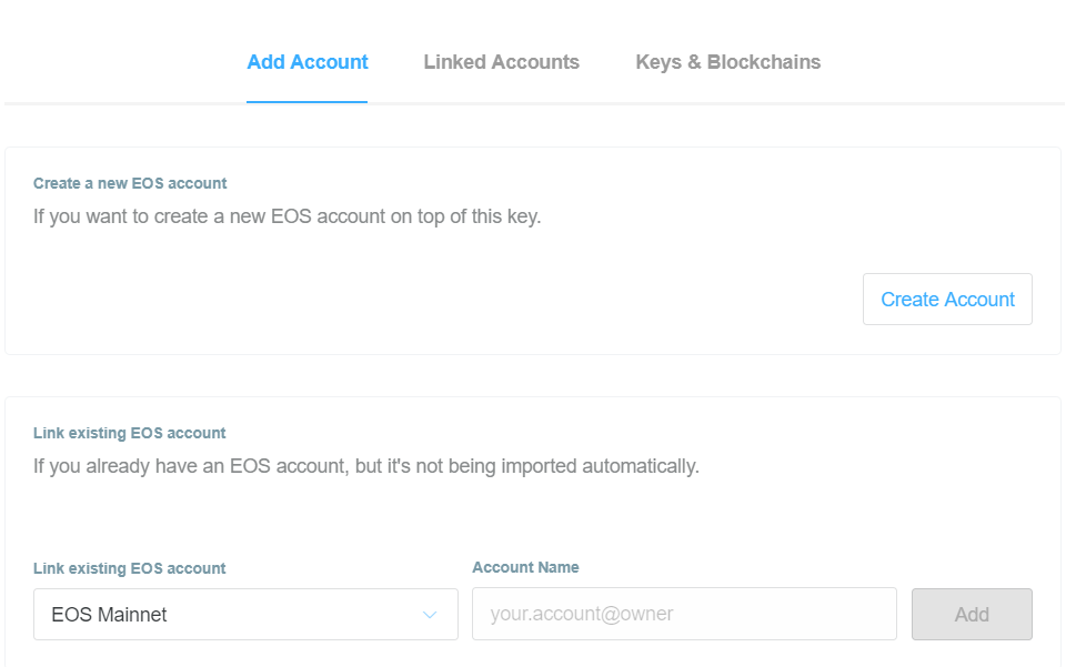 - At this point you will start actually generating or importing the Keys that are necessary constituents for the operation. Clicking on Add Keys will enable you to create new keys, import existing ones, or create a brand new EOS Account.