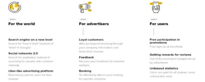 Marketplaces such as Uber will also benefit. ZeroState pays users for their reviews; especially reviews borne out of sincerity.