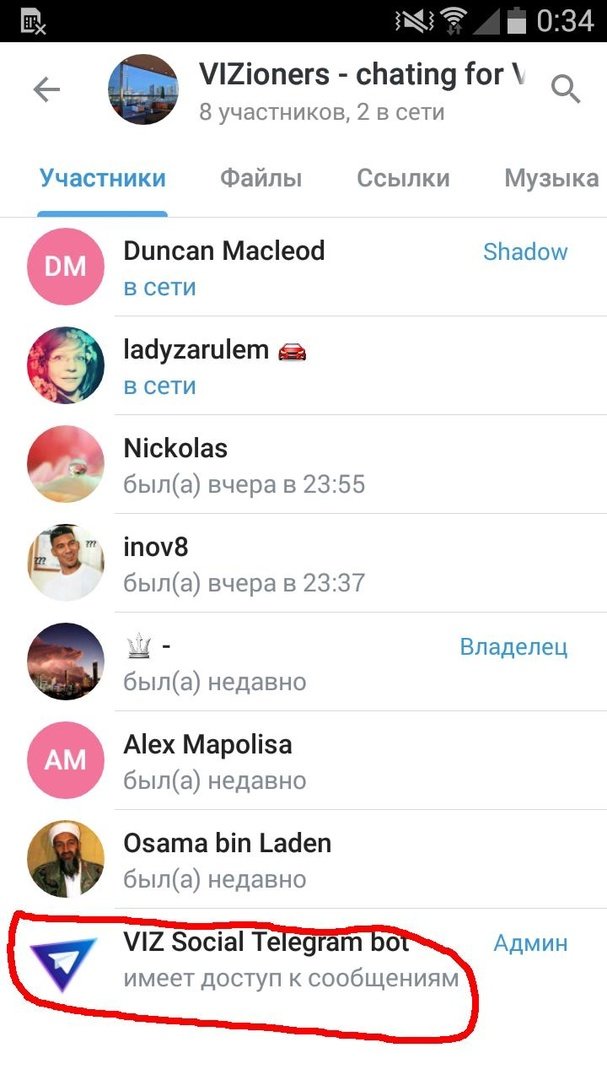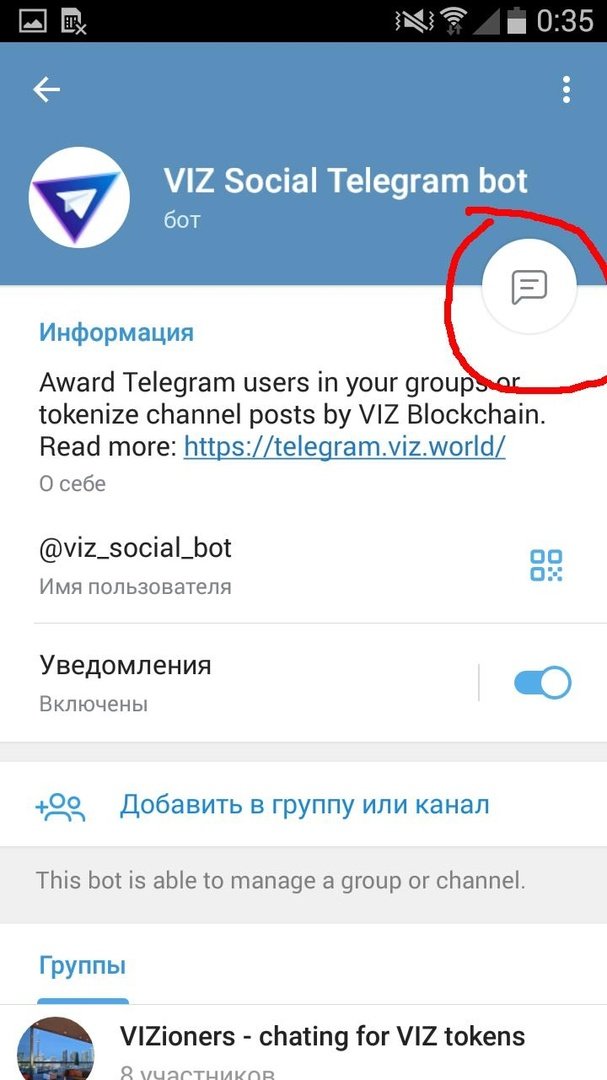 Find VIZ Social bot among the chat participants. If you do not see it in chats, you can find it in Telegram by the name @viz_social_bot