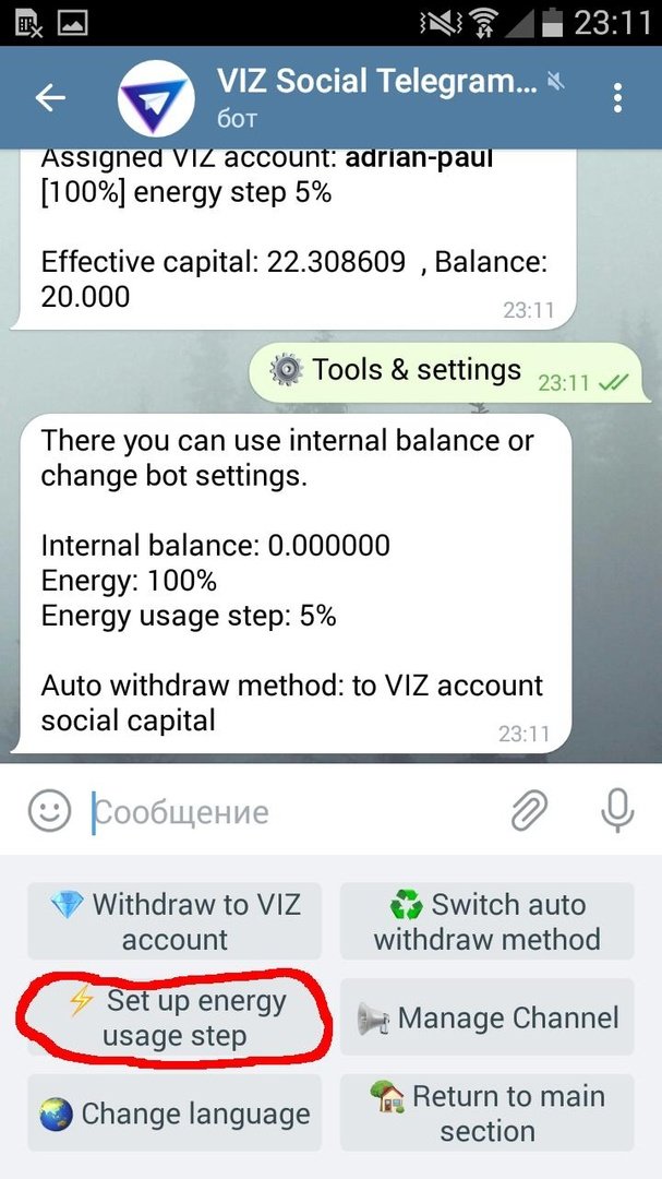 Now, let's say you already have VIZ and Telegram accounts. Perhaps someone in the VIZ community has already sent you some tokens - a reward, an award - in the chat room where the VIZ Social bot functions. The bot memorizes your Telegram account and the number of tokens on your balance. To reward other users, you must withdraw these tokens from the bot's balance to your blockchain wallet.