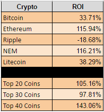 After this weekend's extremely bullish run for most Cryptos on Coinmarketcap.com, I was curious to see if diversifying during a bull run would be beneficial. To my surprise, it was more profitable to diversify over 40 coins than any of the big 5 individually.
