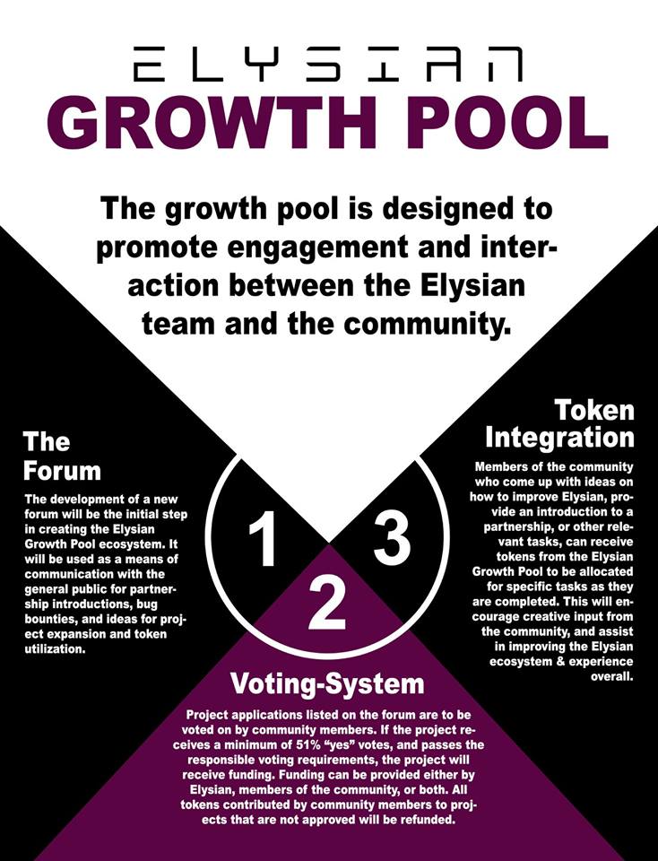 The primary purpose of the growth pool in the Elysian ecosystem is to generate active engagement between the Elysian team and the community. There are several companies in the cryptocurrency space that do not emphasize community growth as a vital part of the project. Stagnant communication between a team and its supporters is a concerning issue that ultimately helps contribute to the potential deterioration of certain projects in the market. The integration of the growth pool into the ecosystem provides an effective utility for the token and a healthy, sustainable model for community expansion.