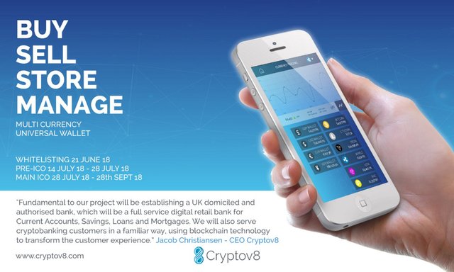 Зараз, за участю банку Великобританії, Cryptov8 трудиться над випуском експериментального проекту в області іпотечного кредитування, управління рахунками і реальним станом банківських облікових записів за допомогою своєї екосистеми.