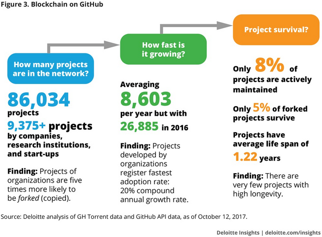When you look at the Deloitte infographic, it seems that Blockchain is not as promising as it is often described. Only 8% of the total number of blockchain projects are actively maintained. Naturally, there are a number of question marks hanging over that percentage.