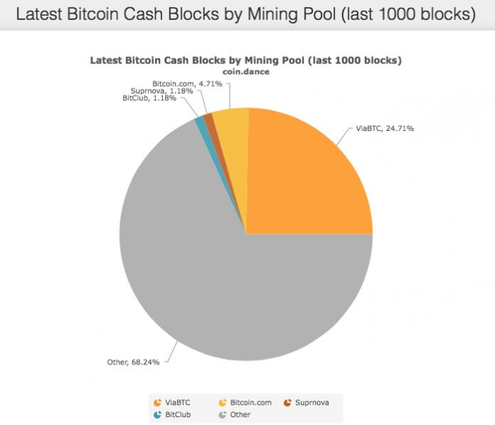Some people think a ‘malicious’ miner might be gaming the network, to hinder further difficulty adjustments. A few people on forums noticed this happening as one person writes, “There’s a pattern I’m seeing, someone with quite a lot of hash power is ramping up and producing two blocks minutes apart every time the adjustment nearly triggers.” Another individual observes the same situation taking place,I have been noticing the same pattern in real time. We almost reached twelve hours, Viabtc has no more than 25PH mining, last block took 339 minutes and BAM we get a thirteen minutes block. This is the third time it happens when we reach over 11.5 hours.‘Honest’ miners have been slowing down or ‘pausing’ for twelve hour periods so they can lower the difficulty even more. Presently the BCH chain’s difficulty is 26 percent of the BTC legacy chain’s mining difficulty. The Bitcoin Cash protocol’s rules detail that in order for the difficulty to adjust down it utilizes Median Time Past (MTP) of the last block and the MTP of the 6 previous blocks has to surpass twelve hours for it to drop another percentage. The Unknown Miner Hashrate Commands Two-Thirds of the Entire Network