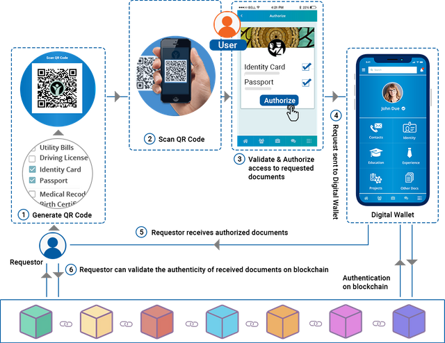 The authorized documents along with the blockchain authentication for each one of them is now shared from the user’s Digital Wallet to the requestor’s device.