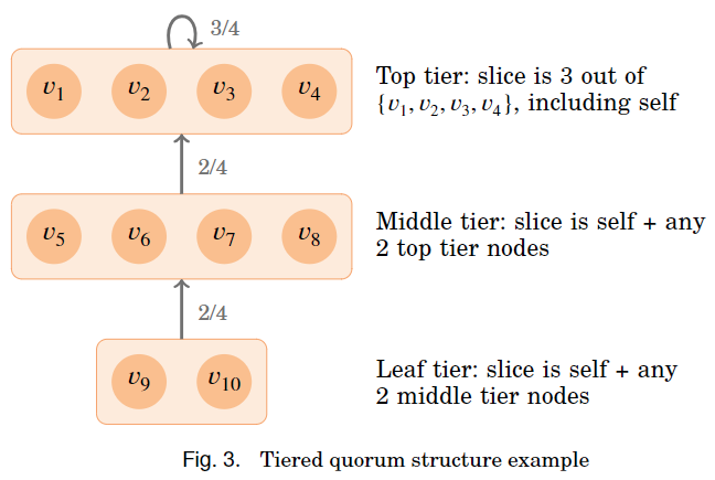 스텔라도 마찬가지로 합의를 이루는 것에 있어서 신뢰도를 기반으로 티어를 정의한다. 여기서 나오는 예시는 네트워크 내에서 노드들의 신뢰를 얻어 인정받는 노드들이 탑 티어로서 존재하고, 다른 네트워크의 노드들이 이 노드들의 표면화된 슬롯 업데이트 결정, 즉 투표들을 보고 판단하게 함으로써 전체 네트워크의 합의를 이루게 한다. 각 티어 계층의 노드들은 자신의 티어를 참고할 수도 있고 상위 티어를 참고할 수도 있다. 이 예시에서는 자신을 제외하고는 무조건 상위 티어의 노드 결정을 보도록 해놓았다. 어떤 노드를 믿어야 할지 불안한 경우 이러한 티어 기반의 쿼럼 구성이 도움이 될 수 있다. 내 상위 티어를 믿지 못하는 경우 내 티어의 일부 노드나 더 높은 티어의 노드 혹은 다른 상위 노드에 연결하면 된다. 핵심은 신뢰 티어가 낮은 노드들의 경우 그 노드가 믿는 다른 악의적일 가능성이 있는 노드들의 투표(표면화된 슬롯)보다 상위 신뢰 티어에서 내려온 투표의 중요도를 높이는 것에 있다. 정말 믿을 만한 사람에게 이야기를 들은 사람의 말을 바탕으로 합의를 이루겠다는 목표이다.