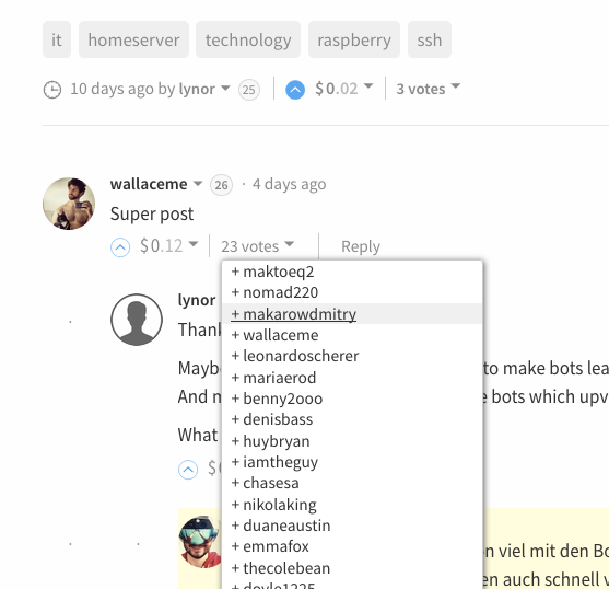 Now take my friend and tutor @lynor. He came here and made a quite elaborate and unseen first post on a usecase for the Raspberry Pi computer. I upvoted him, but that was about it. A week later, he got a random bot post and this post was in turn upvoted by 20 other bots. Nice money share...