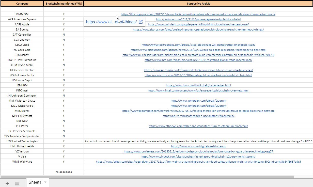 I did some quick analysis: 73% of the Dow 30 companies mention and/or are currently building blockchain solutions...right now. Spreadsheet attached in pic