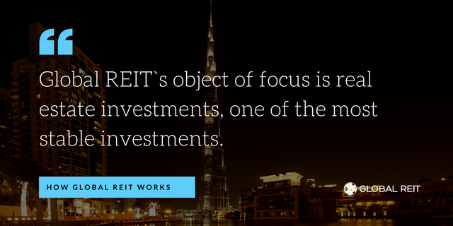 Global REIT is the first REIT-based blockchain technology with clear security and transparency. In Global REIT, it aims to create a true diversification across different classes of real estate assets to enable users to invest seamlessly and profitably into a broad asset-backed portfolio