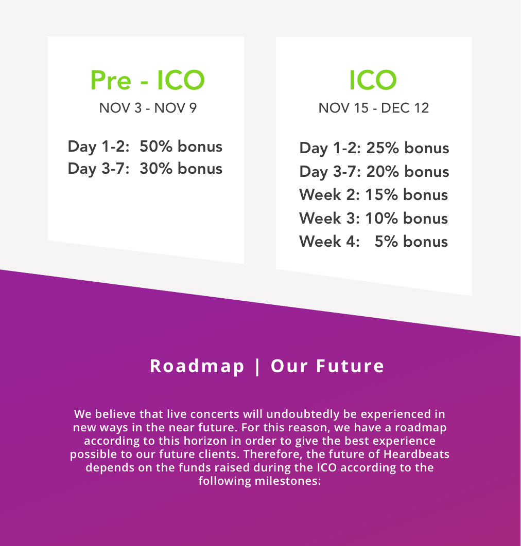 Pre-ICO stage will be starting in November the 3rd 2017 at 00:00 UTC. Everyone will get the below bonuses when buying the heardbeats token