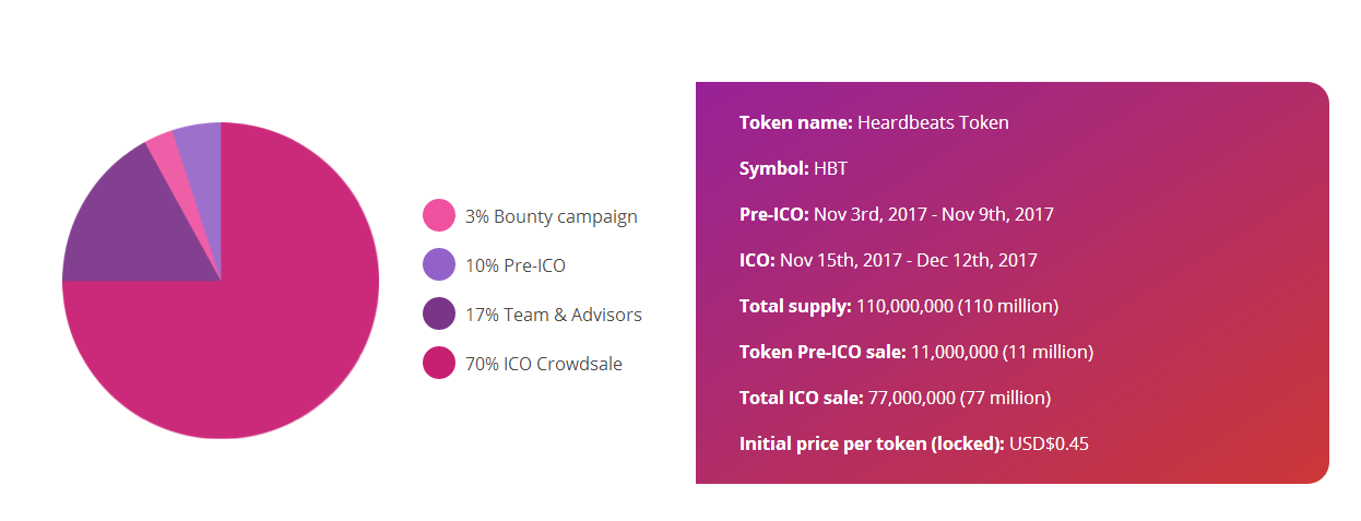The other 20 percent will be split between the Heardbeats Team and advisors 17 percent and the bounty campaign participants 3 percents.