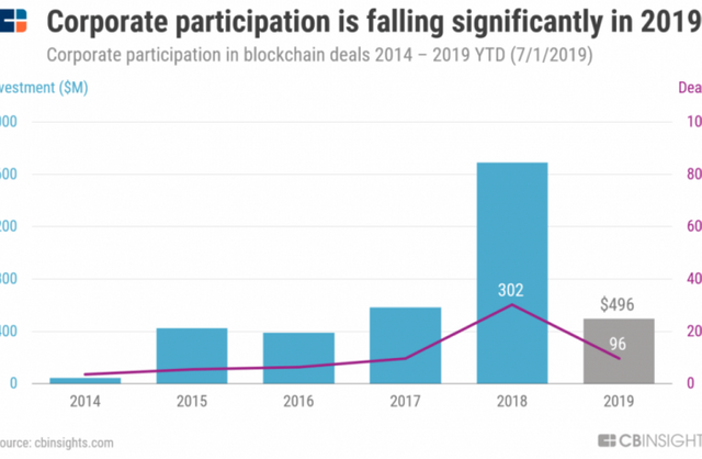 The investment in blockchain companies by venture capital funds is about to drop by 60% in 2019 when compared to 2018, when VC invested $4.1 billion, according to the data provided by CB Insights. So far in 2019 blockchain startups attracted $784 million in 227 deals.